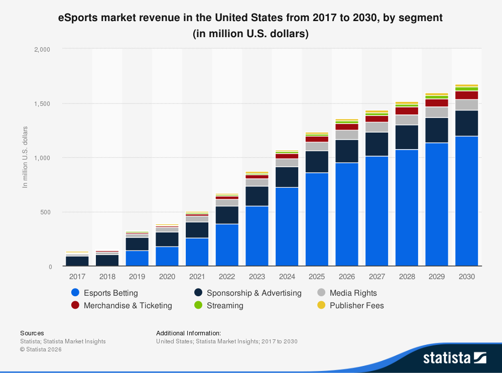 In the US, the eSports market is forecast to generate $1.2 billion in annual revenue by 2030. While in 2017 the vast majority of revenue was centered on advertising and sponsorship, betting will increasingly hold sway, as the chart below shows.